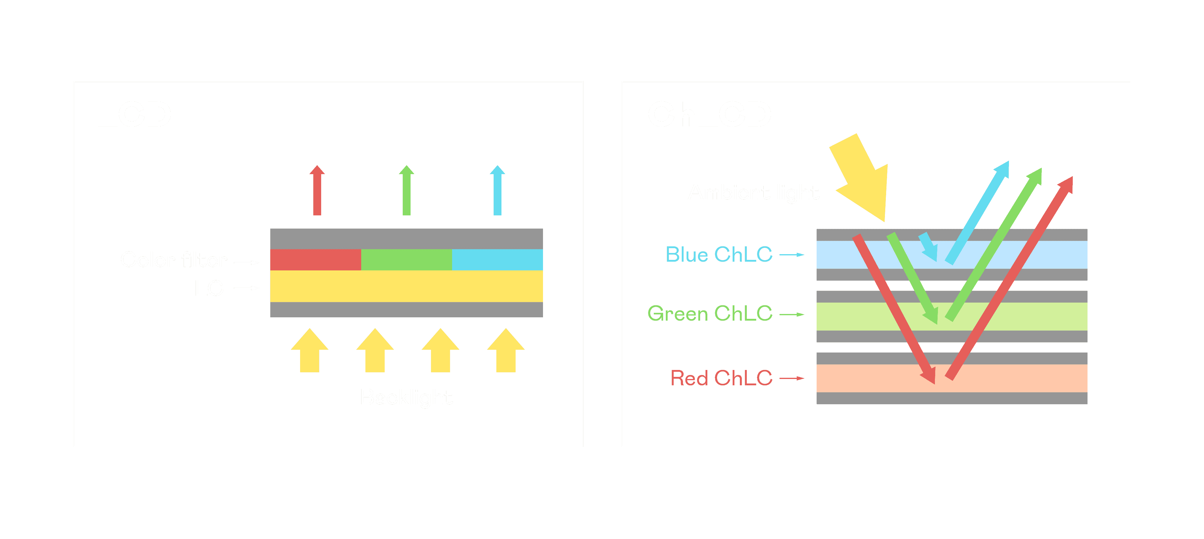 ChLCD 胆固醇液晶就如同纸张一样,,,透过反射环境光来显示影像,,,因此长时间观看不易造成人眼视觉疲劳,,可达到护眼效果。。当处于户外阳光下使用,,LCD 影像容易失真而不易观看,,,,但胆固醇液晶仍可维持较佳的影像品质。。