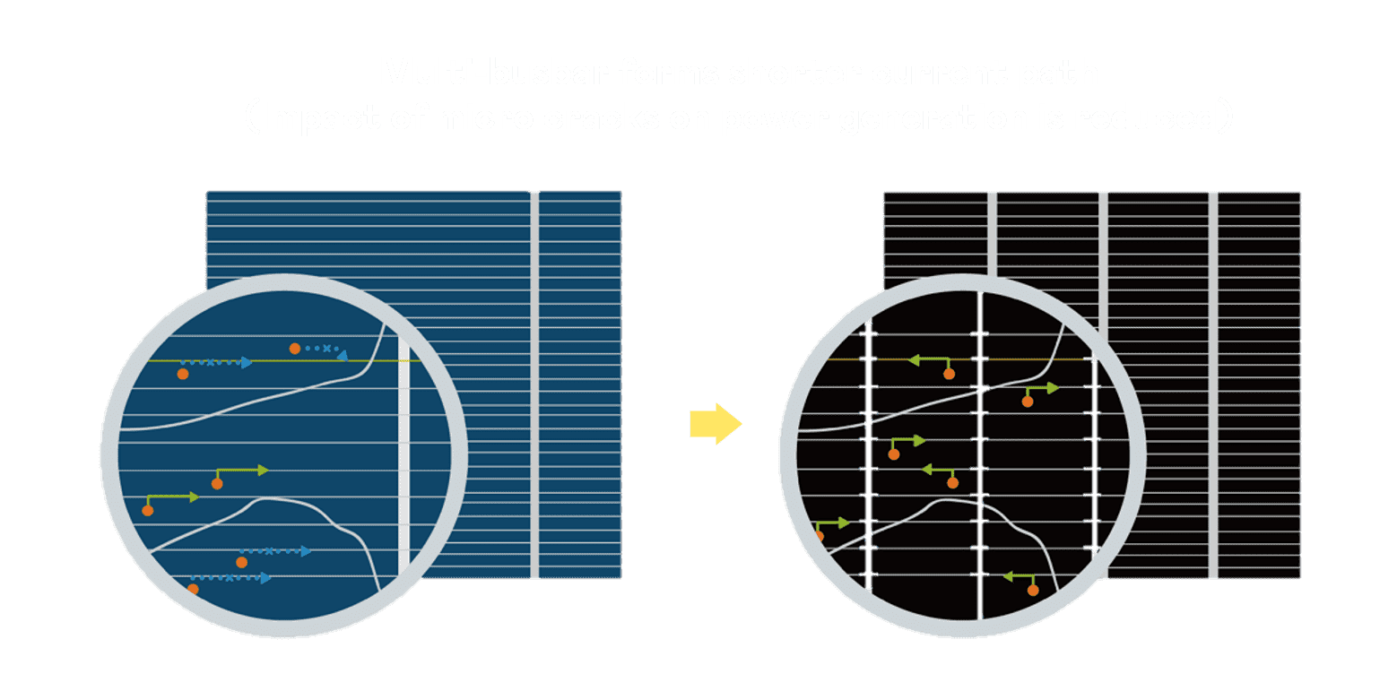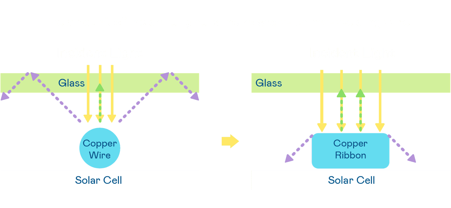 - 电池使用多条铜导线 (Copper wire) 于电池片上形成较短的电流路径,,提高电流收集效率,,,,采用圆形设计的铜导线较传统扁平式的铜焊带 (Ribbon),,,可增加入射至电池的光线量。。。