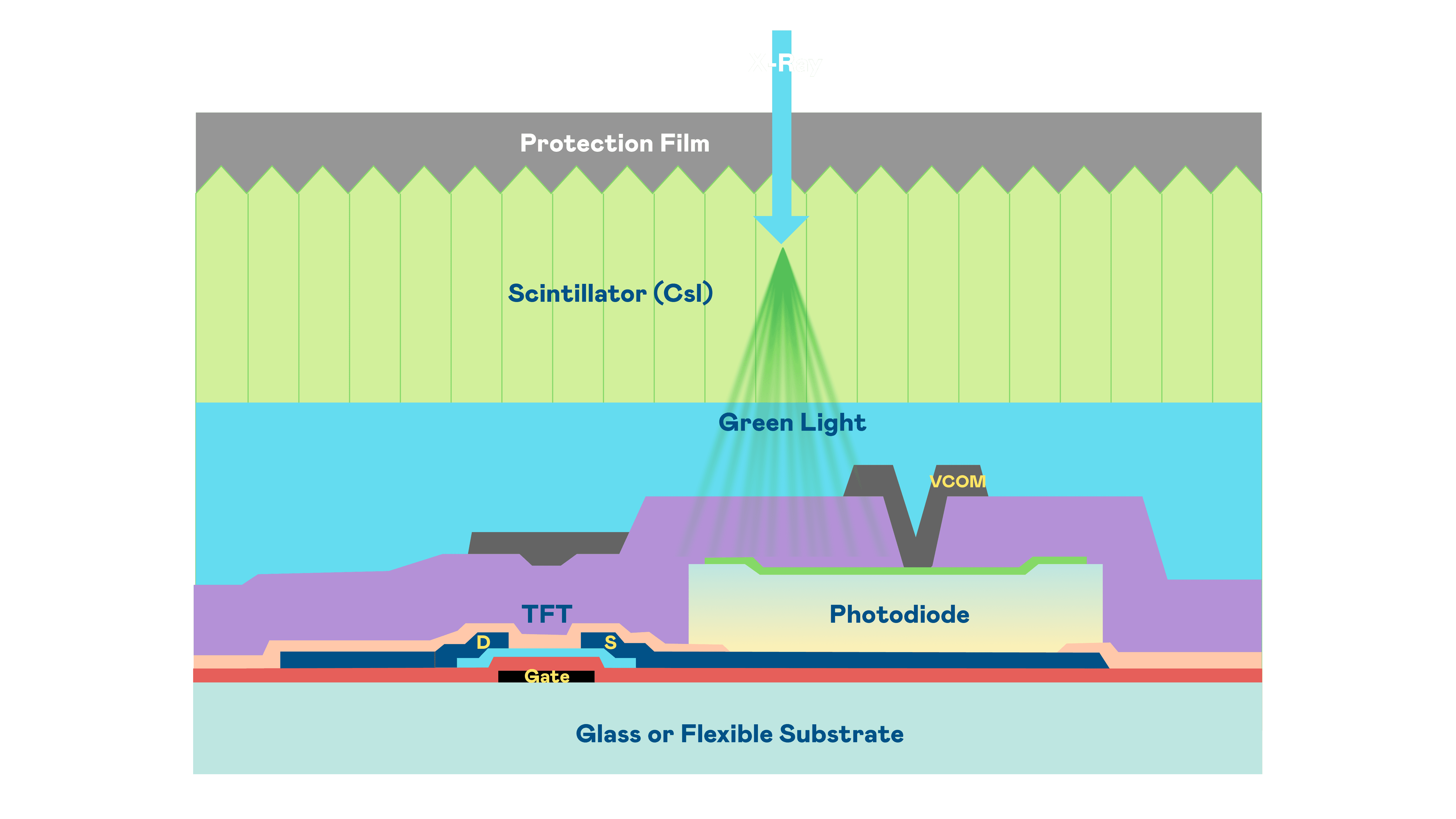 传奇国际的X光影像感测阵列使用薄膜电晶体 (TFT) 作为每个像素的读取开关,,搭配光电二极体(Photodiode)的光电转换元件,,,用以感测X光影像讯号。。。